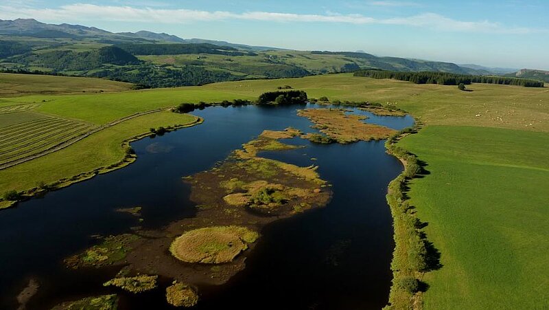 Espaces naturels sensiblesNiché sous la butte de Brion, à 1 186 mètres d’altitude, le lac des Bordes est une perle bleue au cœur du Cézallier. Le paysage est typique du Cézallier : un plateau ouvert avec une vue à 360 degrés, composé de pâtures et de prairies.