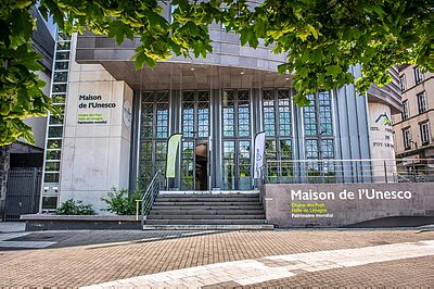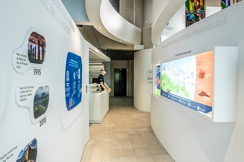 diffusion d'un film de 12 minutes sur une mosaïque d'écrans, table rotative avec réalité augmentée pour découvrir tous les éléments inscrits au patrimoine mondial.