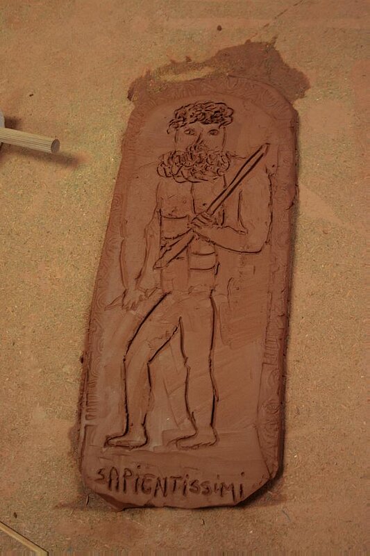 Elle a imaginé un parcours à travers les collections du musée, ponctué d'extraits de légendes mythologiques qui s'est poursuivi par un atelier en deux temps : un jeu de questions organisé avec un système de points/pièces, puis la représentation sur une plaque d'argile d'une divinité vue dans les collections. Au commencement, les élèves divisés en équipes de 5 ont choisi un nom à consonance romaine et une couleur (matérialisée par un ruban coloré). Chaque équipe était composée d'un artisan, d'un observateur et de trois « maillons de chaîne ». L'artisan réalisait le modelage dans la salle d'activité. L'observateur se plaçait dans le parcours devant la divinité figurée sur la céramique sigillée. Les trois maillons faisaient des allers-retours afin de relayer les informations entre l'artisan et l'observateur pour que la représentation de la divinité soit la plus fidèle possible.