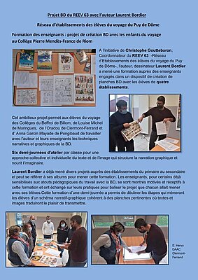 A l’initiative de Christophe Gouttebaron, Coordonnateur du REEV 63 - Réseau d’Etablissements des élèves du voyage du Puy de Dôme -, l’auteur, dessinateur Laurent Bordier a mené une formation auprès des enseignants engagés dans un dispositif de création de planches BD avec les élèves de quatre établissements.