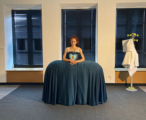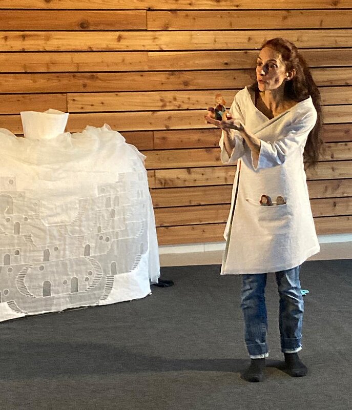 La création textile s’apprécie comme un tableau, animé de l’intérieur par la conteuse. La robe, à la fois costume et décor est partenaire du récit.