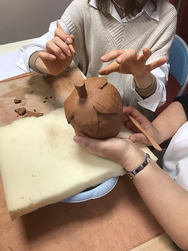 Le 21 novembre, les médiatrices ont accueilli les élèves au musée pour leur présenter le patrimoine archéologique de Lezoux. L’occasion pour eux de s’interroger sur le passé, le présent et comment les deux se lient sur un projet artistique. Ils ont découvert que le mobilier archéologique gallo-romain a inspiré la démarche artistique de Joséphine. Puis ils ont dû répondre à la question « Qu’est-ce que vous ne voudriez pas voir disparaître de la Terre ? » au centre de leur démarche créatrice ! S’ensuit une première initiation à l’élément terre encadrée par l’artiste, en vue de leur future réalisation car les collégiens devront modeler un objet sonore en argile représentant insecte, animal, fruit… qu’ils affectionnent particulièrement pour des raisons toutes personnelles. Après plusieurs semaines de travail préparatoire en classe, le 9 décembre ils ont réalisé leurs œuvres avec l’aide de Joséphine. Au bout de quelques heures de modelage, sont apparus sous les mains des élèves leurs objets-cloches.