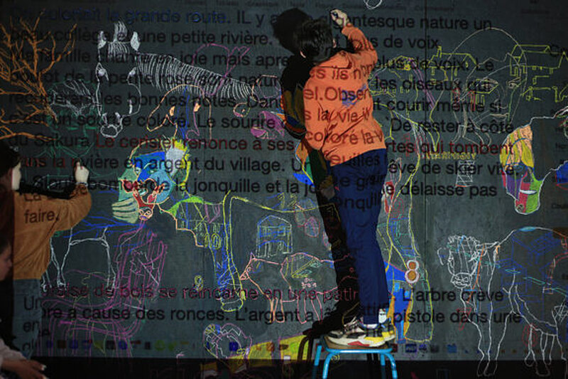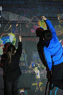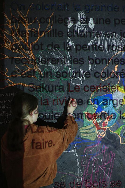 Après avoir proposé des activités pédagogiques autour des Haïkus, des cadres-exquis mais aussi des fake-news en lien avec la professeure documentaliste, la professeure de Lettres Modernes et la coordinatrice ULIS, Nicolas Havette invitait les élèves à reproduire sur des panneaux noirs leurs productions.