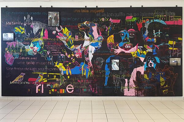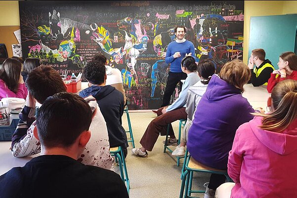 Durant cette période, il a accompagné les élèves du dispositif ULIS ainsi qu'une classe de 6e dans la réalisation d'une œuvre collective qui prend aujourd'hui place dans l'enceinte du collège en salle de permanence.