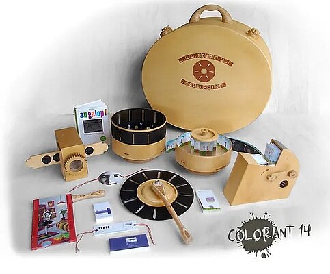 La Médiathèque départementale du Puy-de-Dôme prête aux bibliothèques de son réseau la malle Balbu-ciné, un support de médiation réunissant des objets emblématiques du pré-cinéma pour expérimenter les premières tentatives d’animation des images.