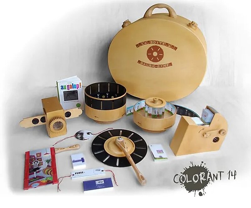 Thaumatrope, lanterne magique, boîte d'optique, phéna-kistiscope, praxiniscope, zootrope, strobotop, etc : ce petit cabinet de curiosités invite à regarder, découvrir, pour ensuite créer ses propres dessins animés.