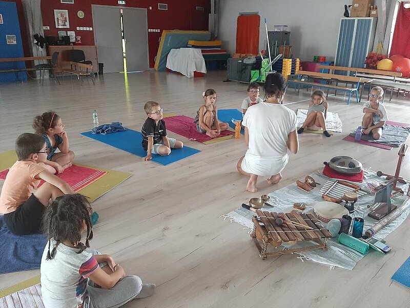 dans sa tête, son corps et son cœur grâce aux postures ludiques de yoga, jeux de relaxation, de méditation et de souffle, le tout accompagné d'instruments de musique du monde.