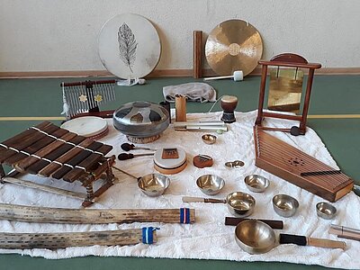 Bien dans mes chaussettes - Christelle GalloisHang-drum, Bols chantants, Svaraveenaa (harpe indienne), Song pods, Bol de cristal, Arbre de pluie, Bol taoîste, Gong, Tambour Chamanique, Carillons Koshi et Zaphir, Carillon Chime, Tubalophone, Cloche tibétaine, Cloche tubulaire, Cymbales indiennes, Balafon, Apeaux, Wa-wa, Bâton de pluie, Tambour de l’océan, Sensuela, Kalimba...