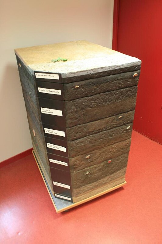 Elle sera prolongée d'un atelier découverte du métier d'archéologue à partir d'une maquette en 3D d'une coupe stratigraphique. Cette maquette entièrement démontable permet d'appréhender la notion d'histoire à travers les siècles à partir de copies d'objets des collections. Ils étudieront enfin un objet de leur choix en remplissant une fiche d'inventaire et en se mettant à la place de l'archéologue sur un chantier de fouille.