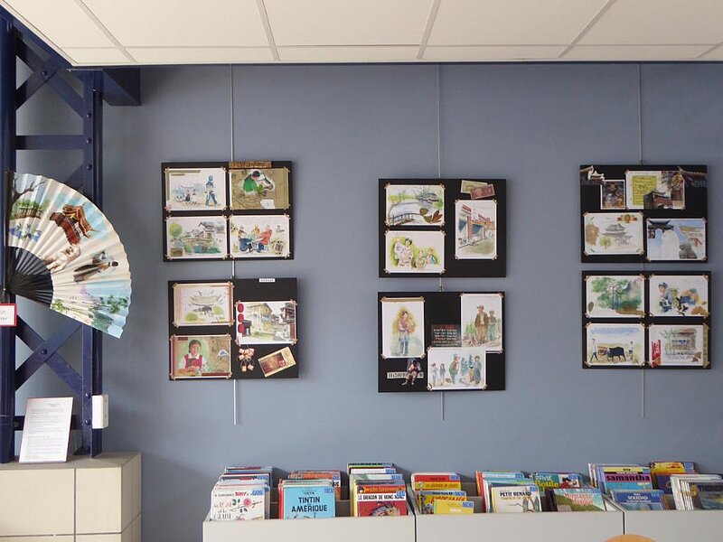 1. Lire, quel délire: Une vingtaine de livres objets de petit format et un kakémono expliquant le lien entre les objets présentés.