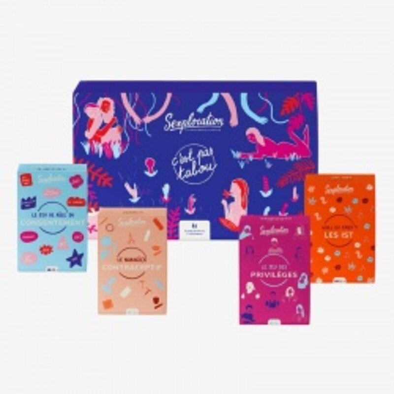 Contient : "C'est pas tabou" (1 plateau de jeu, 110 cartes, 1 sablier, 4 pions, 1 planche organes génitaux, 1 règle du jeu, 2 feuillets d'information) + "Jeu de rôle du consentement" (55 cartes, 1 règle du jeu) + "Jeu des privilèges" (55 cartes, 1 règle du jeu) + "Le nuancier contraceptif" (55 cartes, 1 règle du jeu, 2 feuillets d'information) + "Vrai ou faux des IST" (55 cartes, 1 règle du jeu) + 1 guide d'utilisation