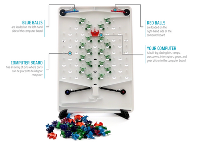 Le principe de Turing Tumble est très simple: on place des billes bleues en haut à gauche, des billes rouges à droite. Ce qu’on sait dès la départ c’est que si une bille tombe dans le compartiment du bas à gauche, une nouvelle bille bleue sera automatiquement lâchée d’en haut (un ingénieux système de levier permet cela). Pareil pour la rouge si une bille tombe en bas à droite. A chaque niveau sa mission: que des billes bleues doivent tomber, que des rouges, une bleue puis une rouge, deux rouges puis trois bleues ou d’autres choses encore que je ne vais pas dévoiler ici. A vous de placer les différents types de connecteurs sur le chemin pour y arriver. Certains d’entre eux sont fixes et imposés par l’énoncé, vous savez combien il faut en placer mais il faut encore trouver où et dans quel sens…