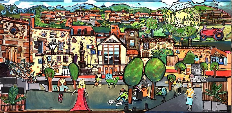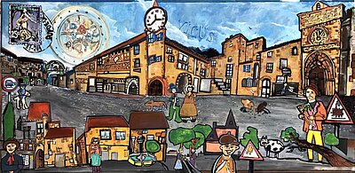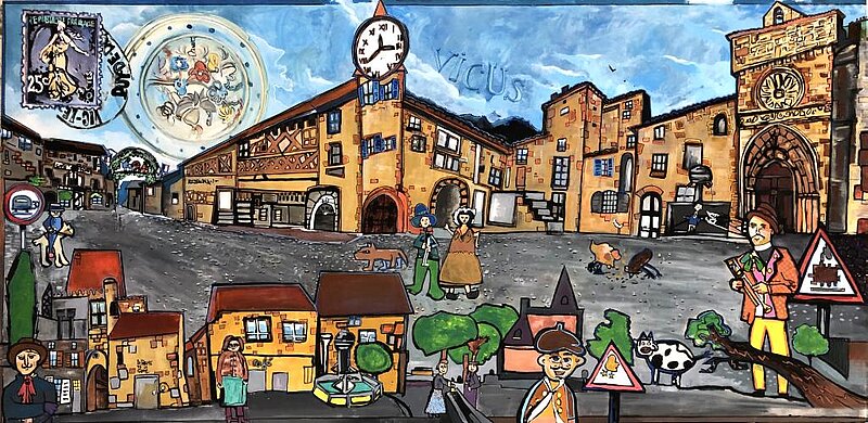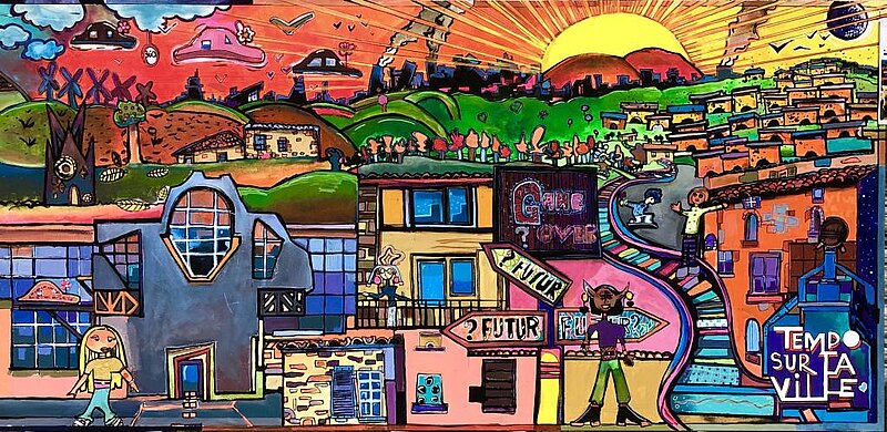 Jean-Marc LE JEUNE-artiste-auteurUne création réalisée très récemment sur panneaux bois avec le concours des enfants du centre. La fresque représente la ville vue par les enfants entre hier, aujourd'hui et demain.