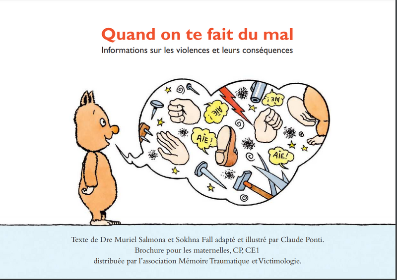 Pôle Solidarités Sociales - Conseil départemental du Puy-de-DômeCe livret pédagogique de 28 pages, distribué gratuitement par l'association française Mémoire Traumatique et Victimologie, offre un soutien aux enfants de la maternelle au CE2 pour les aider à reconnaître leur mal-être (tristesse, peur, panique, angoisse, colère, isolement, perte de confiance, sentiment de culpabilité, etc.) à la suite d'une situation de violence ou de menaces de violence (physique, morale, sexuelle, etc.), à en comprendre les causes et les conséquences, ainsi qu'à fournir des conseils pour apprendre à se protéger et demander de l'aide.