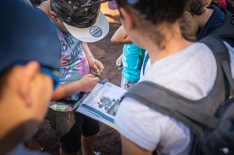 Travaux pratiques de terrain encadré par un animateur géologue avec fiches de terrain, cartes, banque de photos, boussoles, chronomètres suivant l'âge des jeunes...La visite extérieure est complétée par deux films dynamiques pour illustrer les éruptions du passé et du futur.