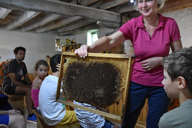 Musée avec 6 espaces différentes . D'abord dans une première salle l'explication de la vie d'abeille et fonctionnement d'une ruche. Puis découverte de rôle de l'abeille dans la nature dans le théâtre de la nature. Nous poursuivons avec l'observation des abeilles dans les ruches vitrées suivi par l'ouverture d'une ruche qu'on observe avec une macro caméra. Après déplacement vers la miellerie pour assister à l'extraction du miel, suivi par une dégustation de miel. La visite est entièrement guidée et adaptée au niveau du public.