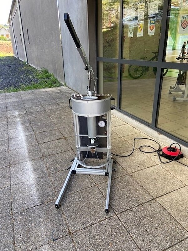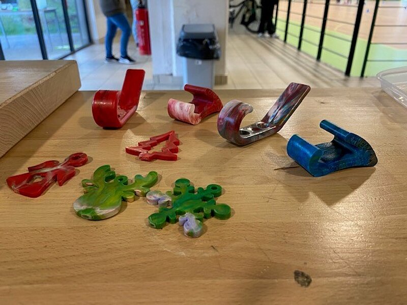 - une presse à injecter manuelle permettant de fondre les broyats de déchets plastiques et d'injecter le plastique fondu dans des moules afin de fabriquer des objets divers (support de téléphone portable, porte-manteau, décorations de noël).